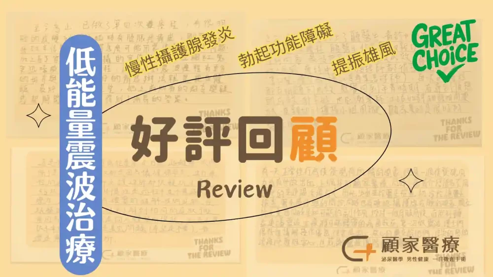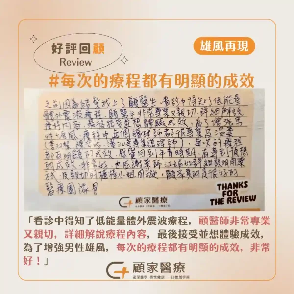 之前因為結紮找上了顧醫師,看診中得知了低能量體外震波療程,顧醫師非常專業又親切,詳細解說療程內容,最後接受並想體驗成效,為了增強男性雄風,療
