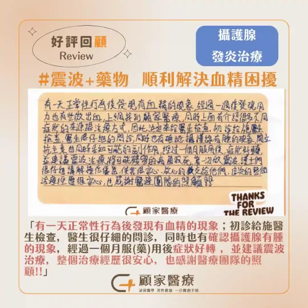 有一天正常性行為後發現有血精的現象,經過一周後發現用力也有些微出血,上網找到顧家醫療,同時上面有介紹很多不同症狀的來源跟治療方式,因此決定來給醫生檢查。初診給施醫生檢查,醫生很仔細的問診,同時也有確認攝護腺有腫的現象,開立抗生素也同時告知可能的副作用,經過一個月服用後,症狀好轉,並建議震波治療將可能殘留的病菌殺死。第一次做震波,護士們很仔細講解操作儀器,使我很安心、放心的交給他們,這次的整個治療經歷很安心,也感謝醫療團隊的照顧!!