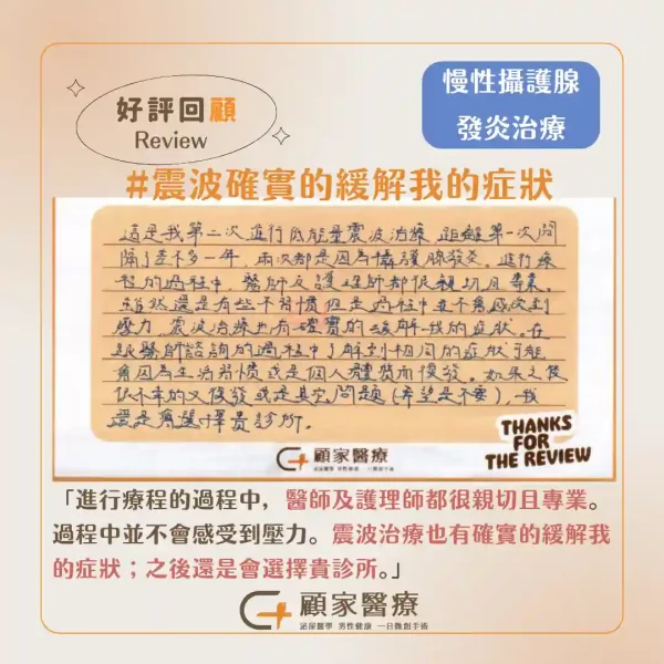 這是我第二次進行低能量震波治療,距離第一次間隔了差不多一年,兩次都是因為攝護腺發炎。進行療程的過程中,醫師及護理師都很親切且專業。雖然還是有些不習慣但是過程中並不會感受到壓力。震波治療也有確實的緩解我的症狀。在跟醫師諮詢的過程中了解到相同的症狀可能因為生活習慣或是個人體質而復發。如果之後很不幸的又復發或是其他問題(希望是不要),我還是會選擇貴診所(顧家泌尿科)。